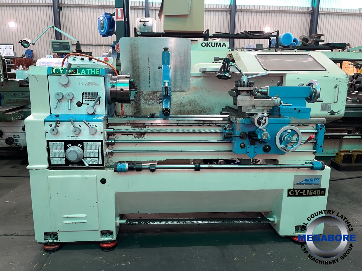 The CY-L1640G Centre Lathe, used. Features 410 mm swing over bed, 1000 mm between centres, 50 mm spindle bore, and a 5.5 kW motor. Enjoy 16 speeds with an RPM range of 33–2000 rpm. Ideal for precision machining tasks. Taper turning attachment. 3 & 4 Jaw chucks.